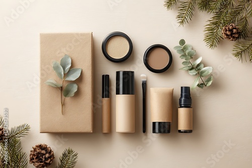 Elegant flat lay composition featuring a curated selection of makeup and cosmetic products, complemented by natural elements and a gift box.