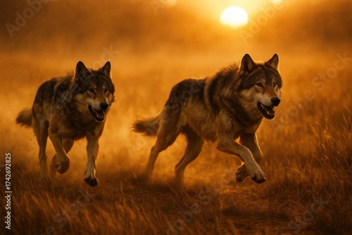 Latvia, Kandava, 2025-08-23, Latvijas kauss A duo of wolves gallops through a field bathed in warm sunlight
