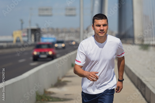 Jogger running on bridge