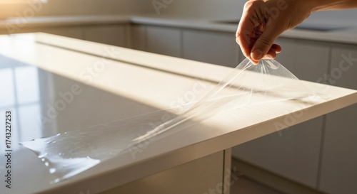 Close-up of a person's hand carefully peeling off a clear protective film from a new white kitchen countertop, revealing its pristine surface in a modern home interior.
