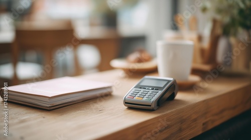 Wooden table with a stack of books and a white coffee cup on it. on the right side of the table, there is a credit card reader.
