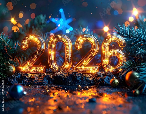 Złoty, świecący napis 2026 pośród gałązek świerku i bombek. Tło sylwestrowe