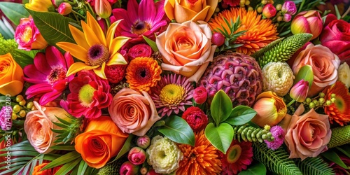Colorful floral arrangement with intricate details and lush greenery in shades of pink, yellow, orange and red , Exotic Flowers, Latin American Culture