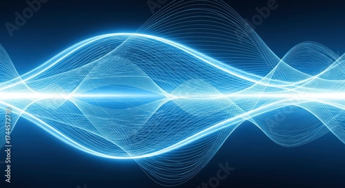Dynamic blue light waves and intricate grid patterns illuminate a dark blue background with bright central glow