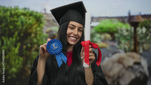 Young hispanic woman proudly smiles in graduation cap holding diploma and award ribbon in sunny park setting.
