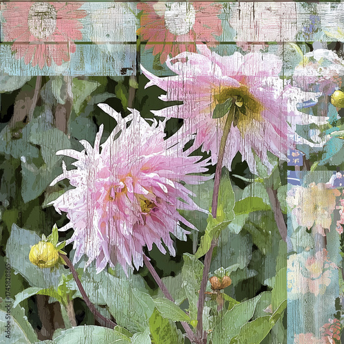 Cyfrowo przetworzony obraz dwóch różowych dalii ogrodowych na tle zielonych liści, z efektem malarskim i nałożoną, shabby chic drewnianą teksturą w pastelach.