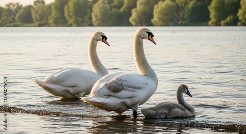 Graceful swans and cygnets bathe in the golden hour light by the lake
