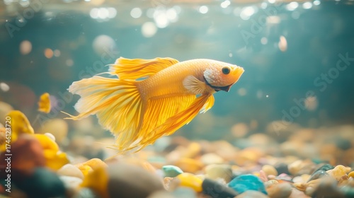 97.A close-up of a stunning yellow betta fish in a serene aquarium, its vibrant scales shining in the light, with the soft ripple of water creating a calming atmosphere and colorful rocks scattered