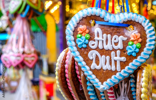 typical ginger bread heart at a kiosk in munich - translation: munich fair