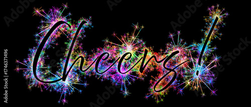 Kolorowe zimne ognie i fajerwerki układające się w kształt słowa CHEERS !