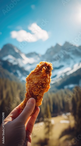 Una mano sostiene un jugoso ala de pollo frente a un impresionante paisaje montañoso cubierto de nieve.