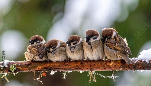Five Cozy Tree Sparrows Huddled Together on a Snowy Branch in Winter