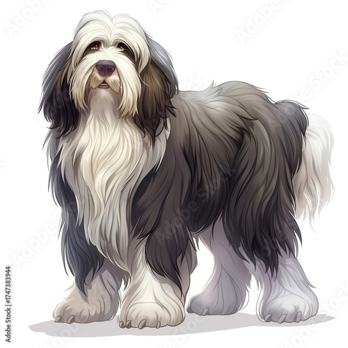 Old English Sheepdog illustration standing, fluffy long-haired Bobtail dog with gentle and friendly expression
