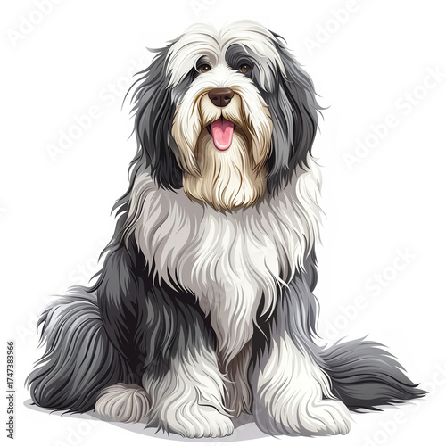 Old English Sheepdog sitting, fluffy Bobtail with long fur and happy face, friendly herding breed illustration