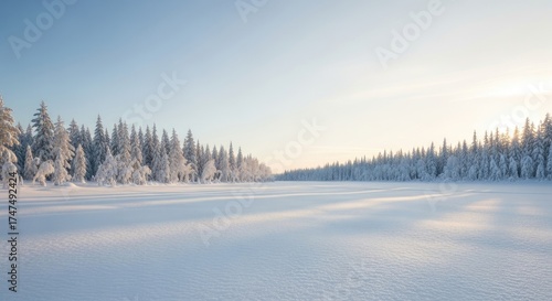 A serene winter landscape with snow-covered trees and a calm, snow-covered field under a clear blue sky.