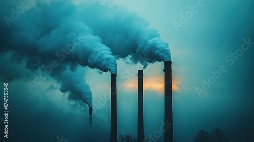 Four industrial smokestacks emitting thick smoke into a foggy blue sky with faint sunlight breaking through, creating a somber and polluted atmosphere