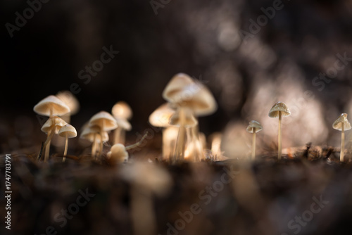 Małe grzyby rosnące w lesie w miękkim jesiennym świetle, spokojna natura makro w ciepłych kolorach i mała głębia ostrości.