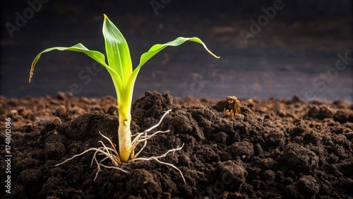 Germinated corn seedling emerging from dark fertile soil with visible root structure and delicate green shoots, nature