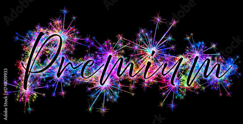 Kolorowe zimne ognie i fajerwerki układające się w kształt słowa Premium w języku angielskim.