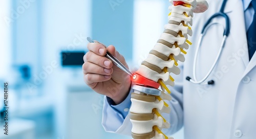Modern medicine offers spinal surgery and disc replacement options for back pain relief, shown on a spine model with medical tools in a clean hospital setting for health solutions