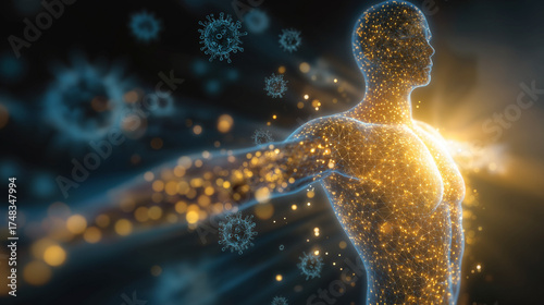 The Strength Within: An abstract representation of the human body, glowing with resilience and strength as it wards off unseen threats. A visual testament to inner fortitude and the fight for health.