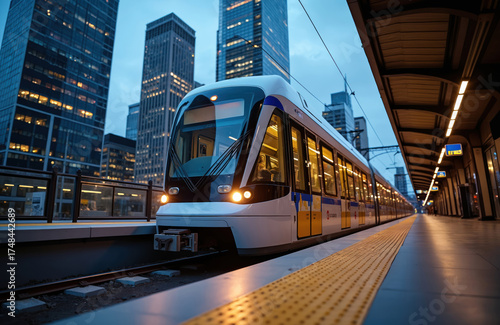 Modern light rail train arrives at city station platform at dusk. Tall buildings with glowing windows line the urban skyline. Commuters wait for public transit. Evening journey begins.