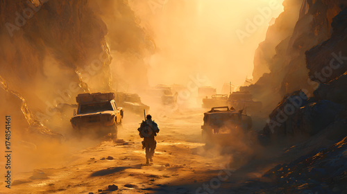 Lone survivor journeying through post apocalyptic wasteland at dawn