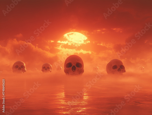 Nastrojowa, dramatyczna grafika 3D z apokaliptycznym widokiem: ludzkie czaszki wynurzają się z czerwonej wody lub mgły na tle krwawego zachodu słońca.