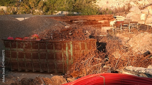 Skład złomu i kontener wypełniony złomem oświetlony promieniami zachodzącego słońca