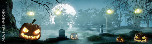 Halloween night cemetery, many graves, with pumpkins carved in the face of the devil. The full moon was misty, above the ground the trees had branches without leaves. 3D rendering