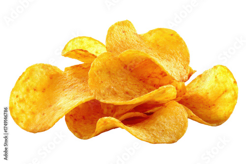 Pile of golden potato crisps with red seasoning against black background chips snack, Isolated On Transparent Background, Png Cut Out