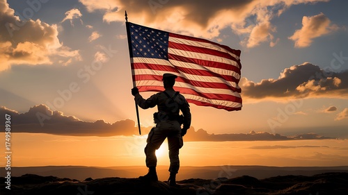 Silhouette of soldier holding American flag at sunset on mountain honoring military service and patriotism