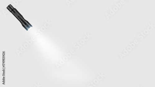 Black modern tactical flashlight casting a powerful, bright white light beam in the dark with a transparent background for concepts of search and discovery.