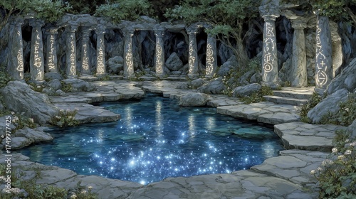 Enchanting ancient ruins reflecting a mystical shimmering light upon a secluded pond hidden deep