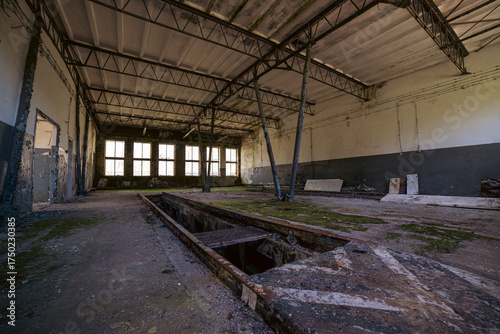 Opuszczona hala warsztatowa z kanałem serwisowym