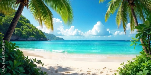 Sun-Kissed Tropical Beach Turquoise Waters Gently Lap White Sands, Lush Foliage Framing an Idyllic Paradise Scene Perfect for Travel and Vacation Projects