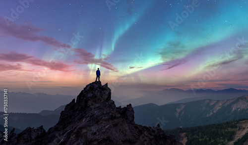 Person Standing On Rocky Peak Under Aurora Borealis Over Mountain Range at Dusk