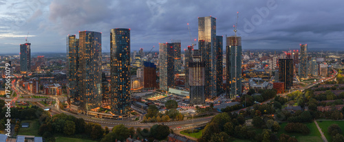 Aerial panoramic view of Manchester skyline at twilight with illuminated towers and Mancunian Way traffic below.