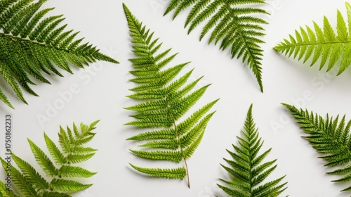 Various types of green ferns are spread out on a bright surface highlighting their unique shapes and textures. The arrangement emphasizes the natural elegance of the leaves.