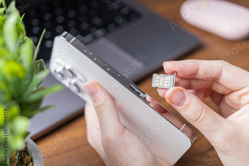 Human hands inserting a dual SIM card into a sleek white smartphone, representing essential mobile technology, global connectivity, and network activation service