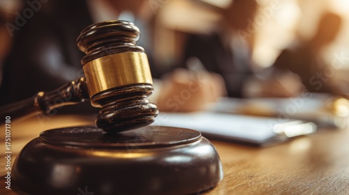 Close-up of judicial gavel resting on soundblock with blurred courtroom background for legal proceedings and justice concept