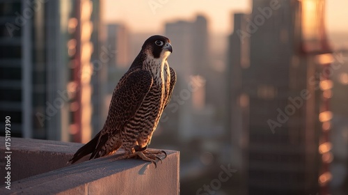 A majestic falcon perched on a rooftop at sunset overlooking a city skyline.