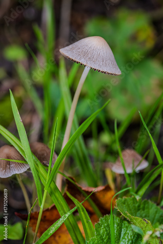 Wachsende Pilze im Morgenlicht unter grünen Gräsern in einem feuchten Wald