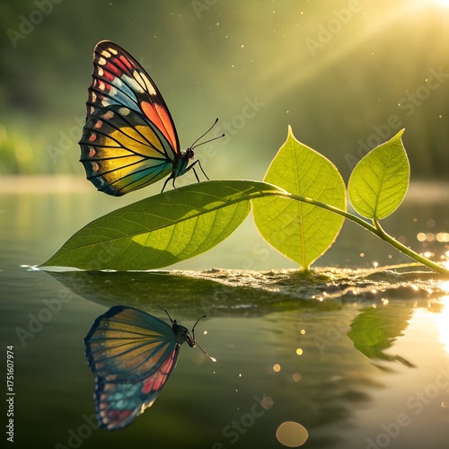 Colorful butterfly resting on a green leaf above a still pond, reflection perfectly visible in water, glowing sunlight through wings, dreamy natural realism