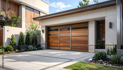 木調の質感がおしゃれに映えるガレージシャッターと洗練されたエクステリア空間