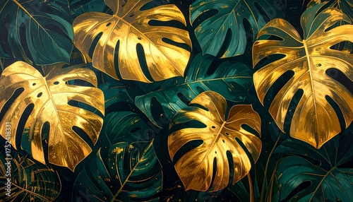 Golden monstera leaves, tropical foliage, botanical pattern, luxury design, decorative elements, nature-inspired texture, exotic plants, elegant background, vibrant greenery, tropical jungle, lush lea