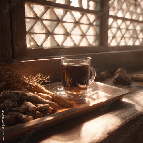 따뜻한 햇살이 비치는 아침, 신선한 인삼과 약초로 우려낸 한방차가 담긴 찻잔
