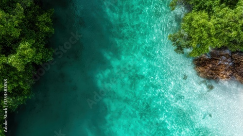 Aerial view of stunning turquoise waters seamlessly blending with verdant trees, creating a picturesque scene that highlights the beauty of nature at its finest.