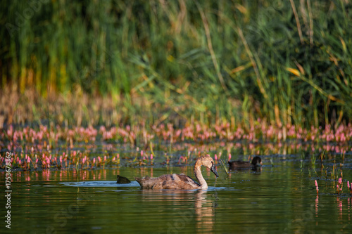Baby Swan (Cygnus Olor) Foraging on Water. Cute Wildlife, Close-Up Nature