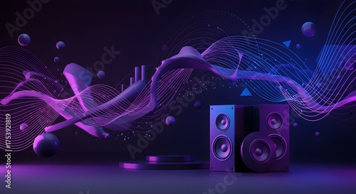 Abstract, purple and blue digital art with speakers, flowing lines, geometric shapes